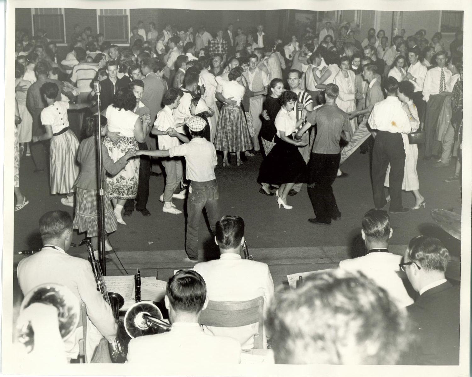 DescriptionBlack and white photograph of the Street Dance on Church Street facing south; Couples can be seen dancing in the Street; the band can be seen sitting and playing music along the bottom of the photograph