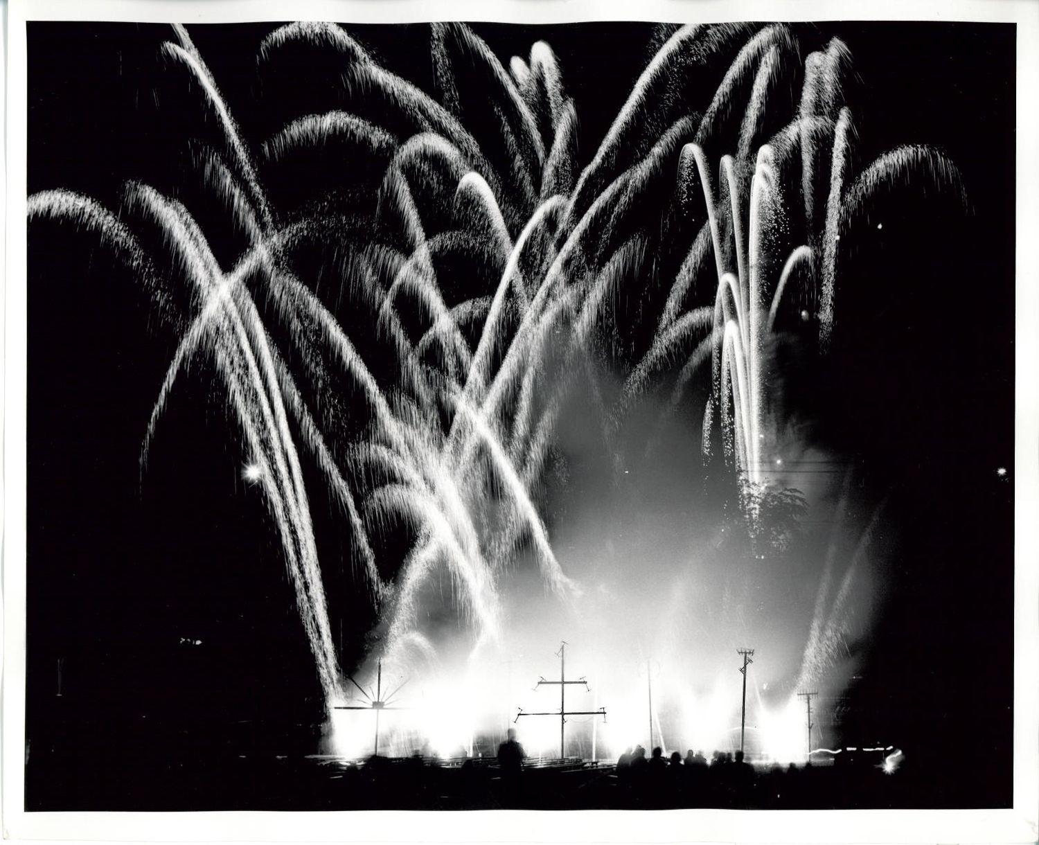 DescriptionBlack and white photograph of Fireworks at Busby Park; Palm fireworks can be seen lighting the night sky in Busby Park