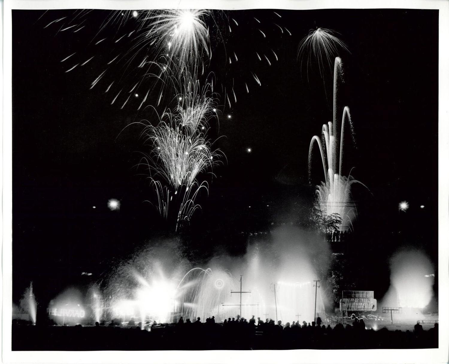 DescriptionBlack and white photograph of Fireworks at Busby Park; various fireworks can be seen in the photograph; Spectators can be seen watching the fireworks along the bottom of the photograph and also on the Radial Bridge on the proper left