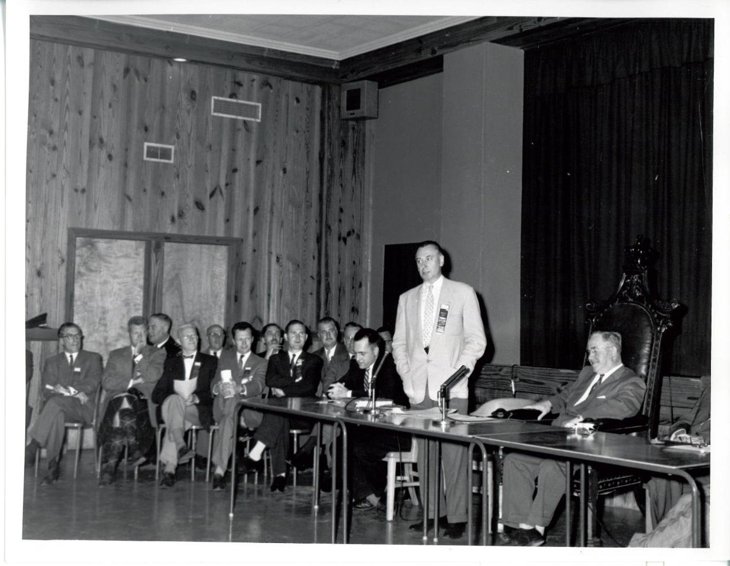DescriptionBlack and white photograph of the Special Council Meeting for the Twinning of Oakville and Dorval on June 29th 1957; Mayor Robert Pratt of Dorval can be seen standing and giving a speech; Mayor William Anderson of Oakville can be seen sitting in the Mayor's Chair to the right of Mayor Pratt; On the left are a group of men sitting and watching the Council Meeting