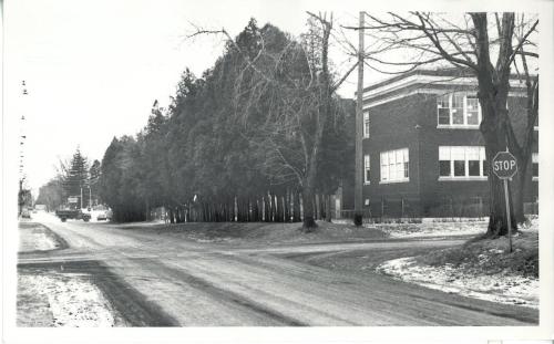 DescriptionBlack and white photograph of Westwood School on the Northwest corner of Rebecca Street and Wilson Street; Part of the front of the school can be seen on Wilson Street; The intersection of Rebecca and Wilson Street can be seen on the bottom center of the photograph; Further down Rebecca is the intersection of Rebecca and Kerr Street; Cedar trees can be seen on the Northside of Rebecca running along the side of the school property; A stop sign on the northeast corner of Rebecca Street and Wilson Street can be seen on the proper left