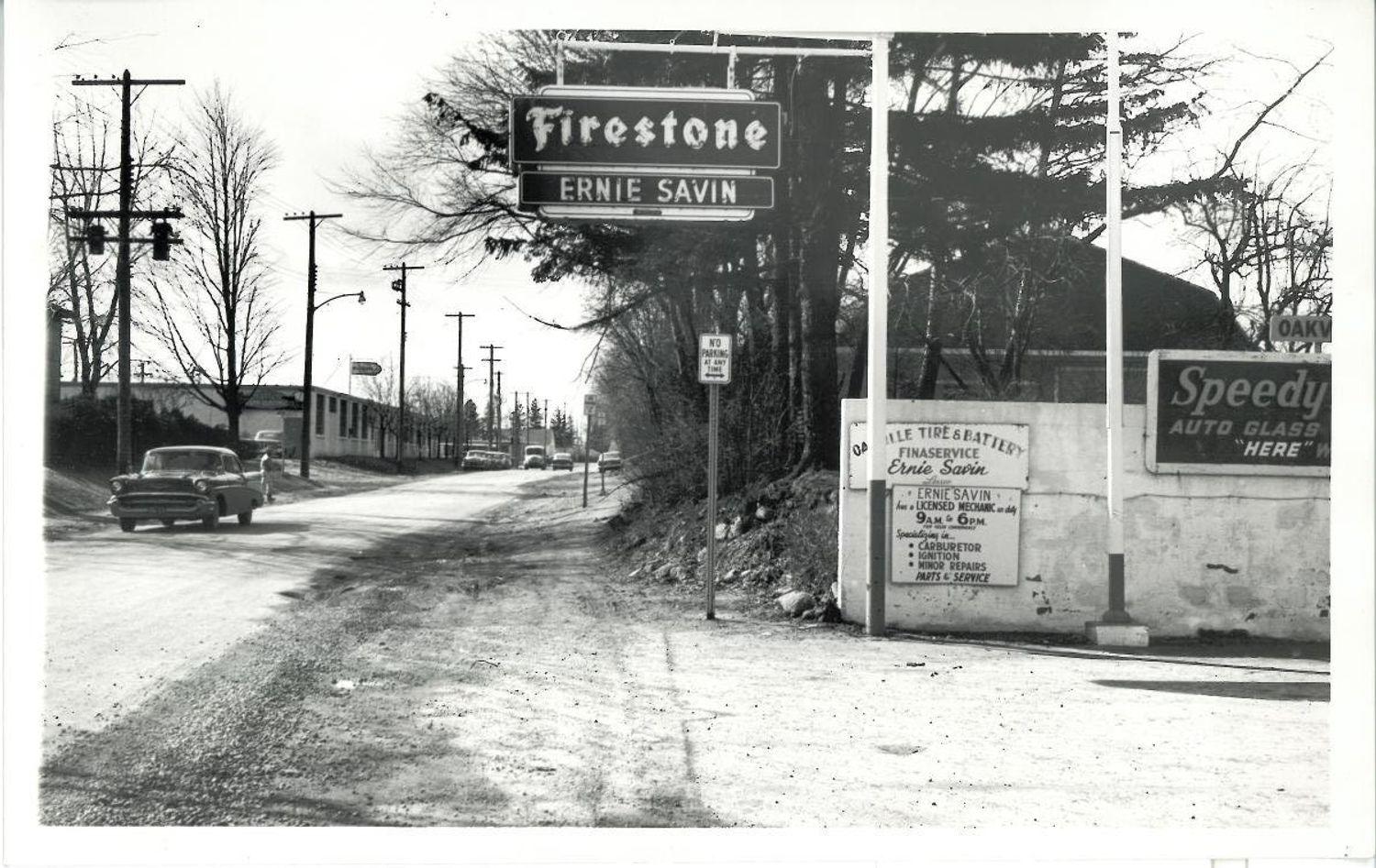 DescriptionBlack and white photograph of Rebecca Street looking West from Kerr Street; On the proper left is "Ernie Savin Service Station" that was located on the northwest corner of Rebecca St. and Kerr St.; A large neon light sign for "Firestone ERNIE SAVIN" can be seen center on the lot of the service station; Oakville Arena can be seen in the distance behind the service station; vehicles can be seen traveling along Rebecca St.in both directions;