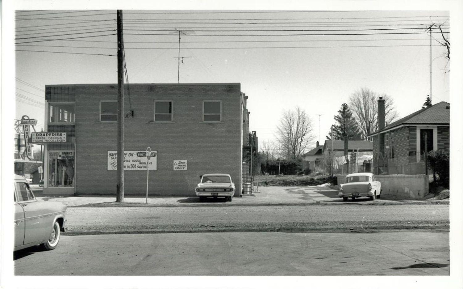 DescriptionBlack and white photograph of the side of a commercial building on the southwest corner of Rebecca Street and Kerr Street; The building has a light brick exterior; A parking lot can be seen at the back of the building; two cars are parked on the property; On the proper right is the front of the building; A sign can be seen above the store windows that reads " Dominion Furniture"