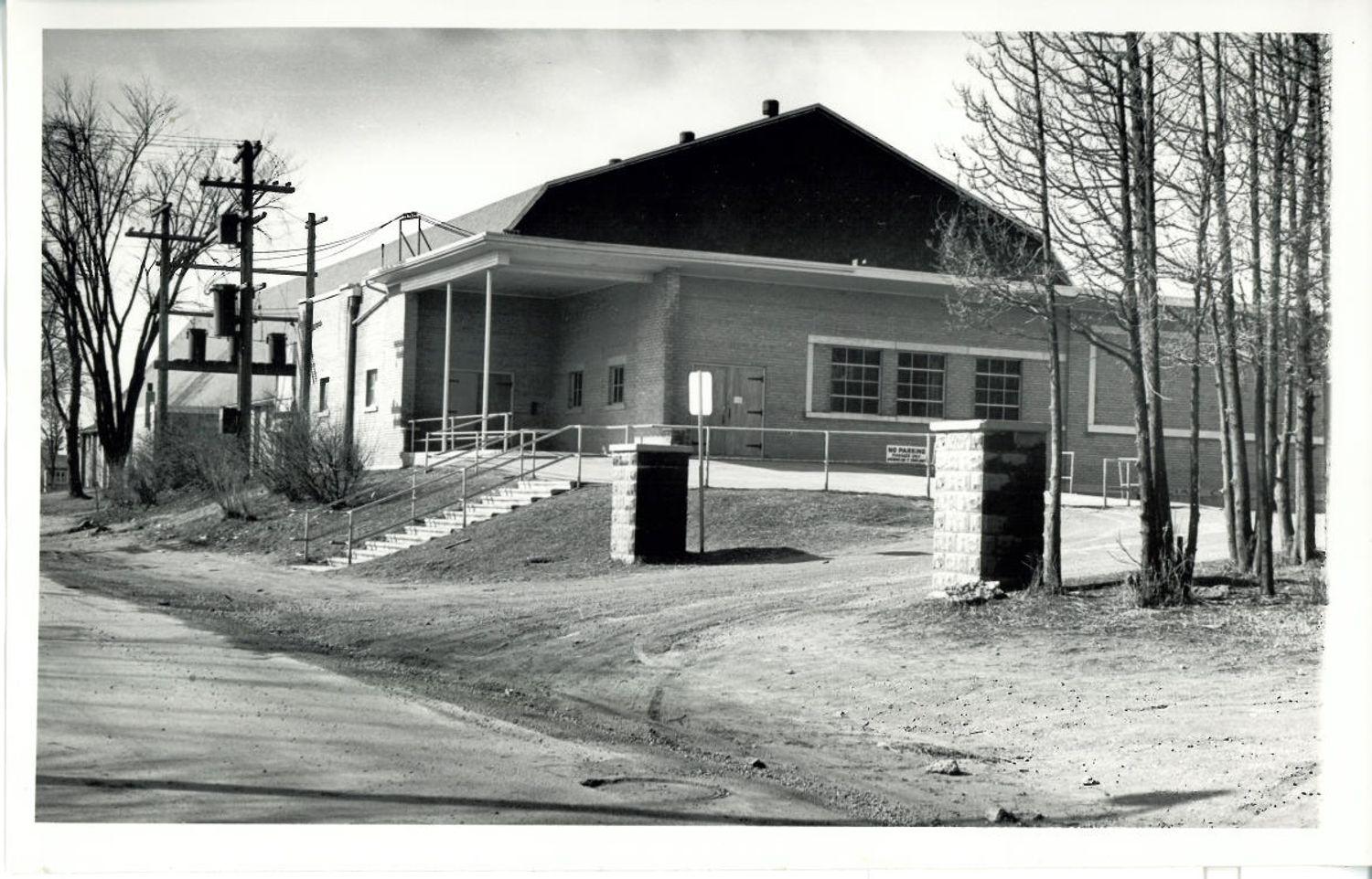 DescriptionBlack and white photograph of exterior eastside of Oakville Arena; The photograph is taken from Rebecca Street; Two brick pillars are leading into the parking lot for the arena off of Rebecca Street;
