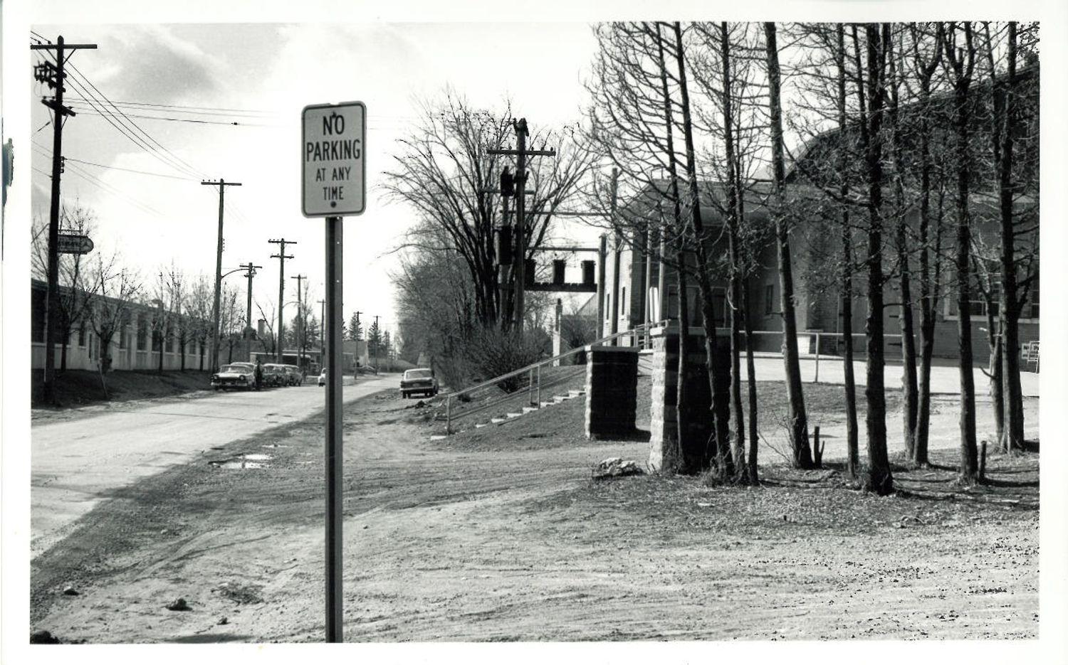 DescriptionBlack and white photograph of Oakville Arena on the Northside of Rebecca Street; the stone pillars to the arena can be seen at either end of the driveway entrance; there is a "No parking at any time" sign on the north side of Rebecca Street;