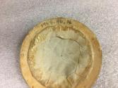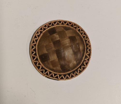DescriptionCircular ornament/brooch, basket weave hair design in various shades of light brown, protected under domed glass, zig-zag and linear white and red rolled paper border around glass.