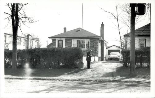 DescriptionBlack and white photograph of a residential building on the Southside of Rebecca Street just West of Kerr Street; The bungalow has a faux brick asphalt exterior; A single car driveway can be seen leading up to a single car detached garage; The front of the home has a hedge running along the front of the building and a large tree on the front boulevard; Part of Rebecca Street can be seen running along the bottom of the photograph