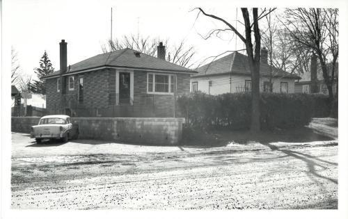 DescriptionBlack and white photograph of a residential building on Rebecca Street just west of Kerr Street; The residential building is a bungalow with faux brick asphalt exterior siding; To the left of the building is a commercial parking lot; A retaining wall can be seen between both properties; A hedge can be seen running along the front of the property; In front of the hedge is a large tree; On the right of the property is another residential bungalow with white siding