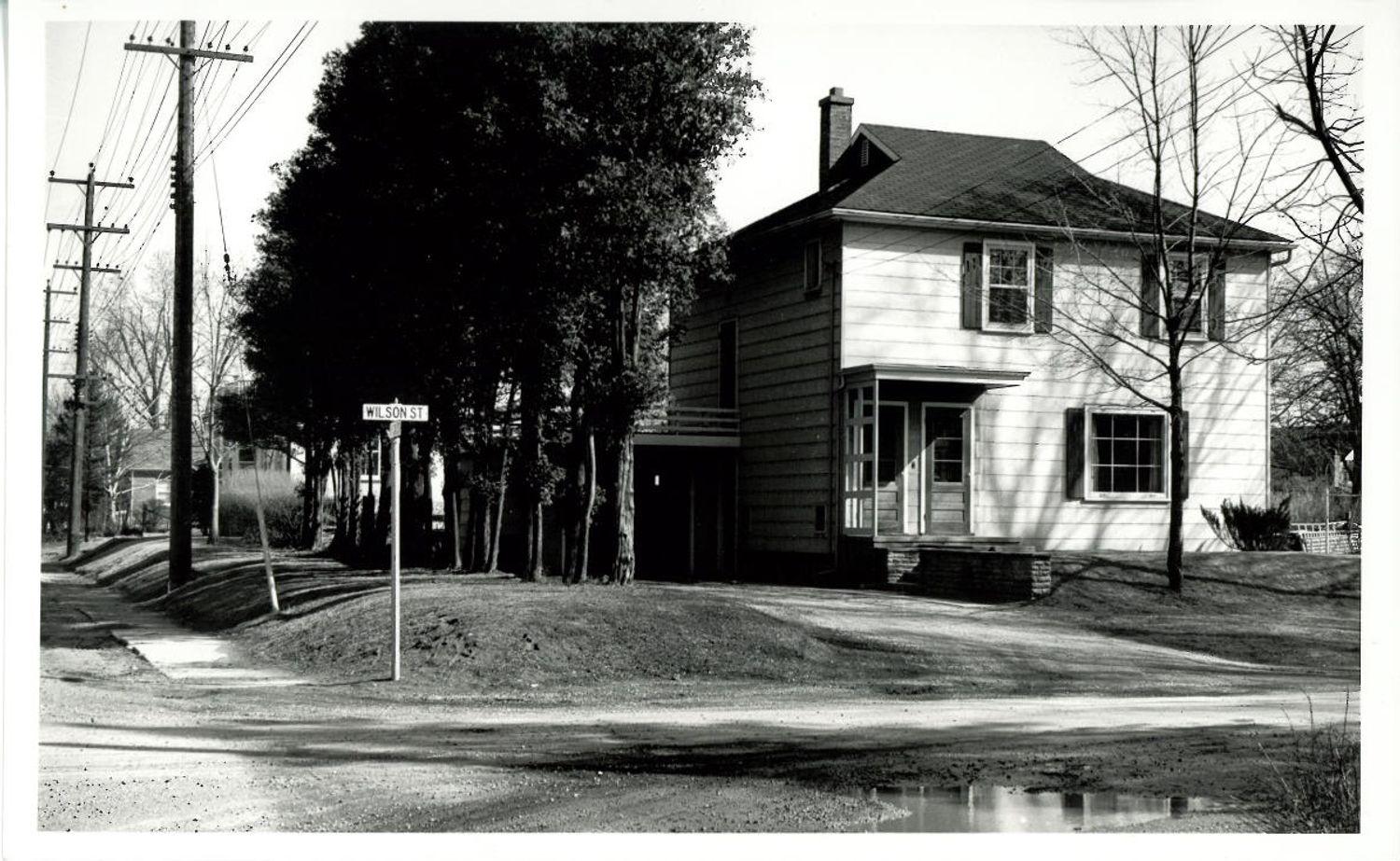 DescriptionBlack and white photograph of a residential property on the southwest corner of Rebecca Street and Wilson Street; The building is on Wilson Street and is a two story property; A single car driveway can be seen leading towards a single car garage; The building has white siding exterior and has steps leading up to a small porch; On the proper right of the photograph is a row of trees; The corner of the property there is a street sign that reads "WILSON ST"