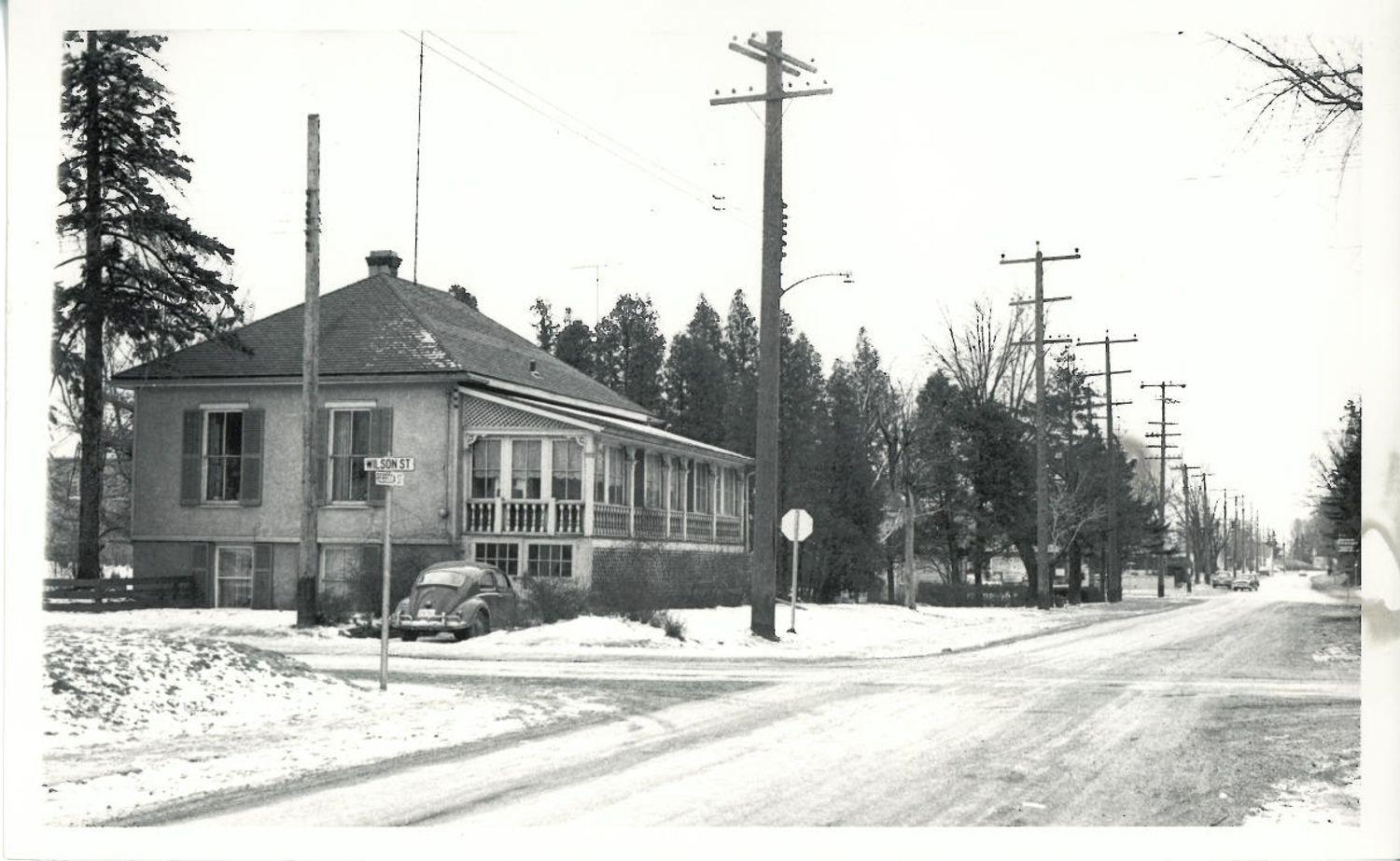 DescriptionBlack and white photograph of a residential building on the southwest corner of Rebecca Street and Wilson Street; The two story home has a stucco exterior and an enclosed front porch facing Rebecca Street; A Volkswagen Beetle can be seen parked on a single can driveway at the residential building off of Wilson Street; In front of the residential building is the Southeast corner of the intersection; A street sign for "WILSON ST" and "REBECCA ST" can be seen on the corner; The back of a street sign can be seen on the southwest corner on Rebecca Street; Hydro/telephone poles can be seen running along Rebecca Street