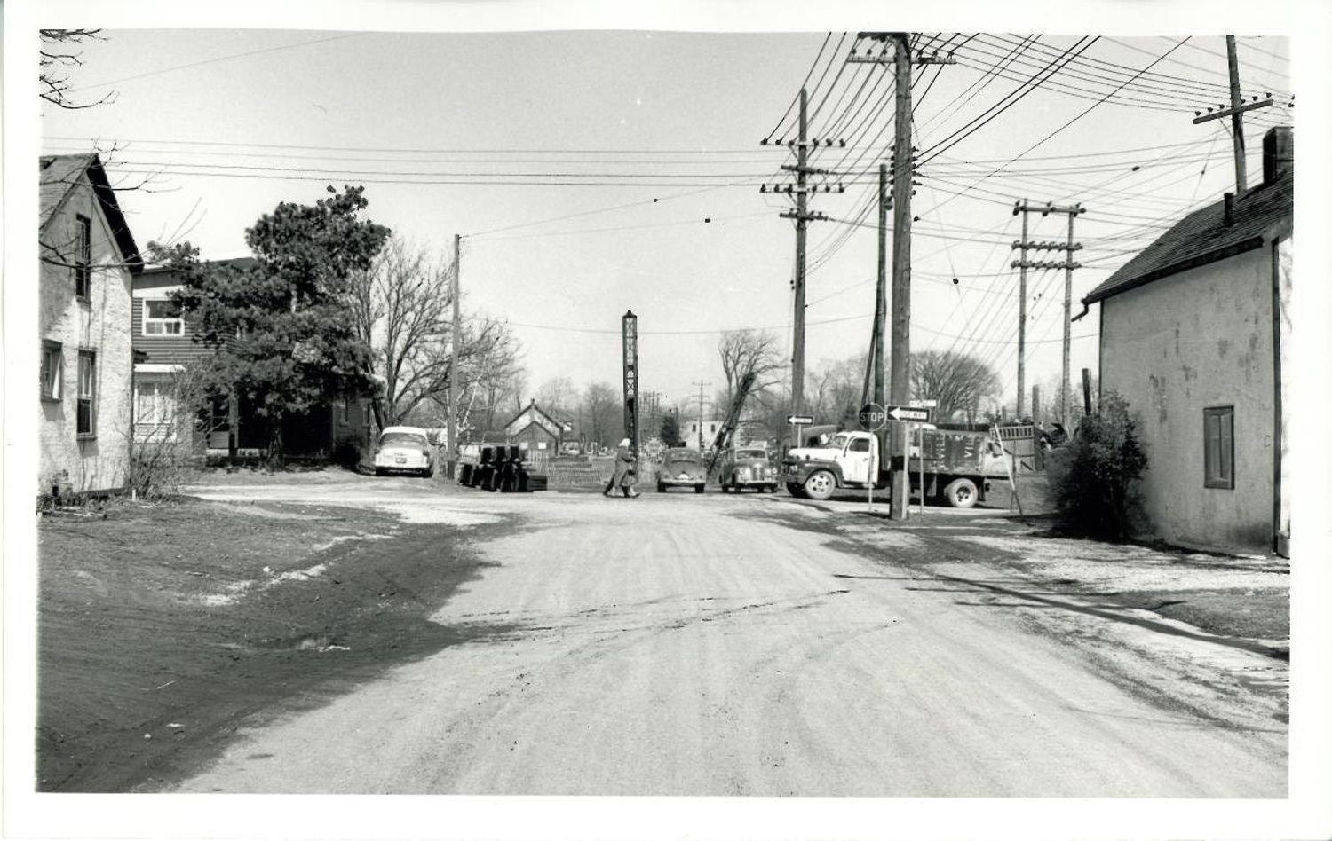 DescriptionBlack and white photograph of the intersection of Rebecca Street and Forsythe Street facing East towards the destruction of the Radial bridge over Sixteen Mile Creek; In the far center is a sign "DEAD END" and is fenced off while the Radial bridge is being demolished; Vehicles and materials can be seen in front the fenced area; There are residential houses on either side of Rebecca Street; Two people can be seen center walking across Rebecca Street at Forsythe Street;