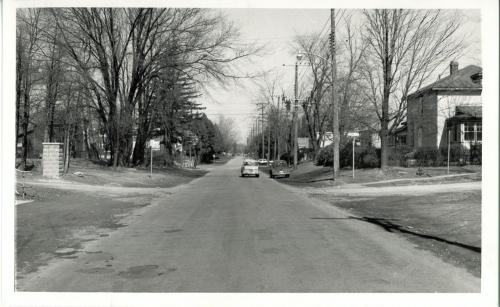 DescriptionBlack and white photograph of Rebecca Street facing East at Brant Street; On the proper right is the driveway into Oakville Arena; On the Proper left is the corner of Brant Street and a row of residential buildings; A car can be seen traveling East on Rebecca Street; There is a Volkswagen Beetle parked on the Southside of Rebecca Street just past Brant Street; Hydro/telephone poles can be seen along the Southside of Rebecca Street; In the distance is the intersection of Rebecca Street and Kerr Street;