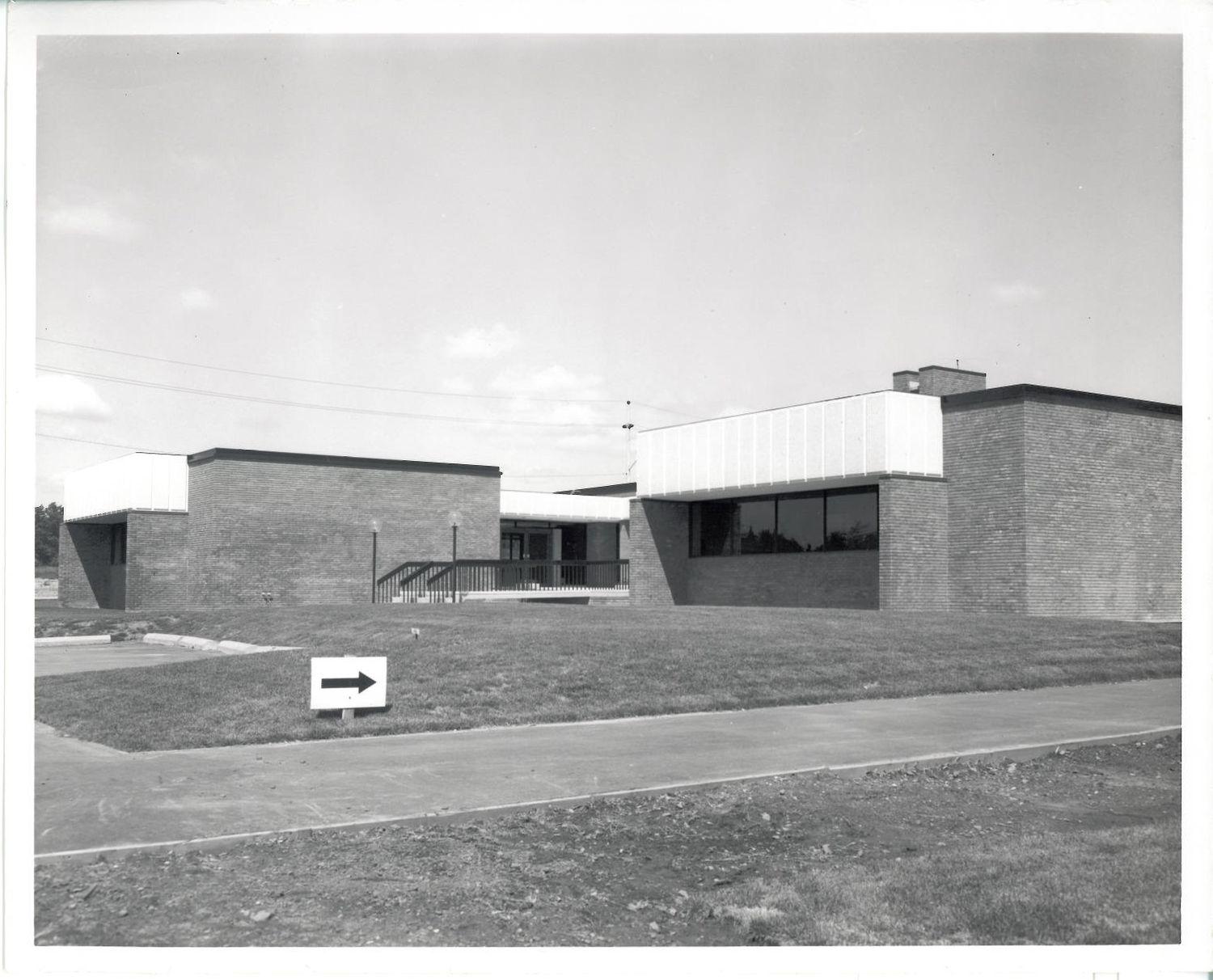 DescriptionBlack and white photograph of the completed Police Building on White Oaks Boulevard; The building has a red brick and concrete exterior; Steps can be seen leading up to the main doors of the building; Part of the parking lot can be seen on the proper right of the photograph;