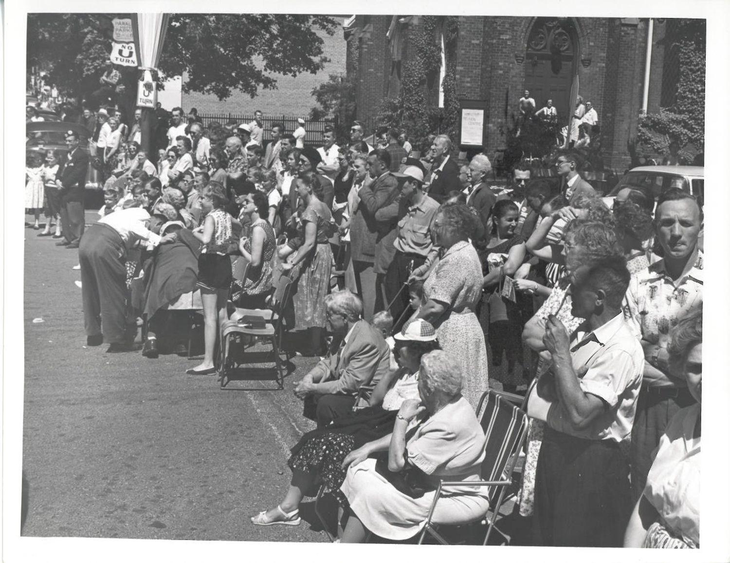 DescriptionBlack and white photograph of a crowd of people watching one of the Centennial events on Colborne Street; People can be seen standing and sitting on chairs on the sidewalk; A few people can be seen standing on the church steps; The front steps and doors to the church can be seen on the proper left;