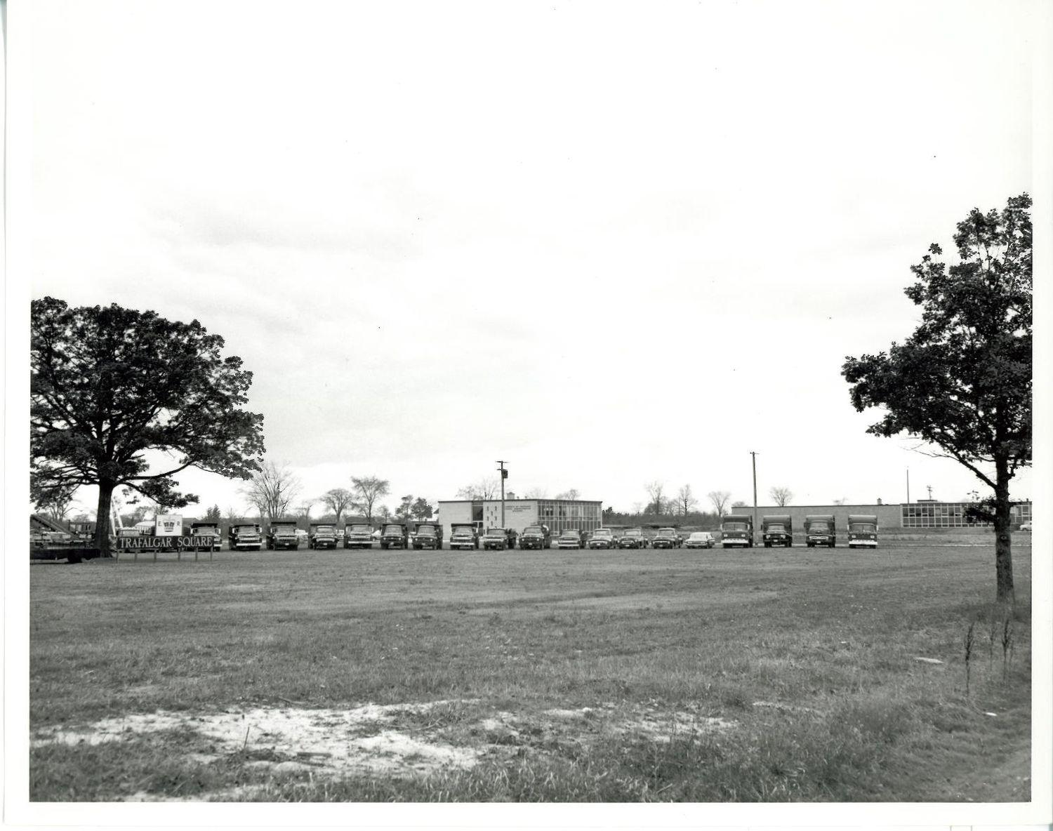 DescriptionBlack and white photograph of Trafalgar Square; The Trafalgar Township School Administration Building can be seen in the far background; a row of vehicles can be seen parked in front of the buildings on the Trafalgar Square land; a large sign can be seen on the proper right that reads "TRAFALGAR SQUARE"