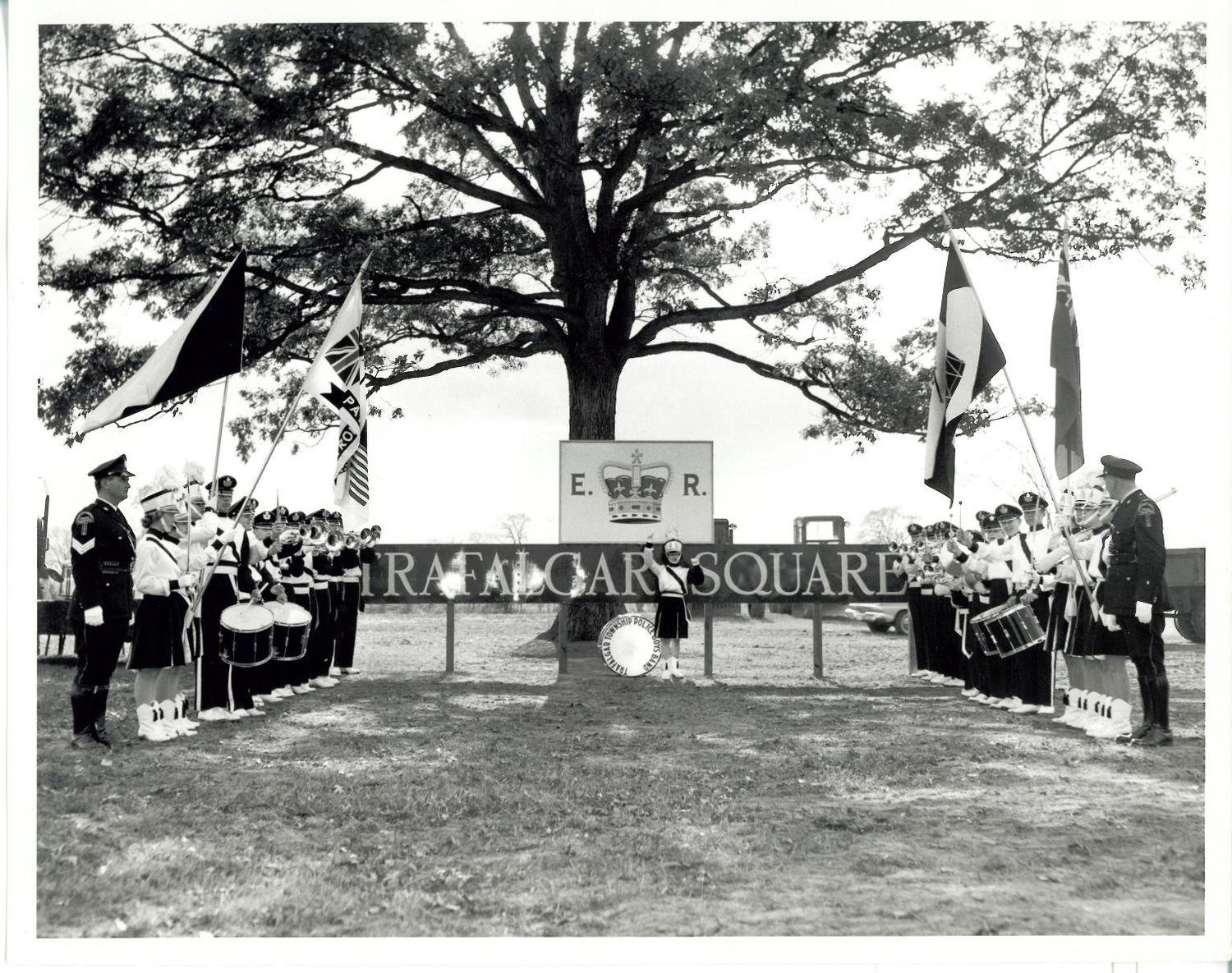 DescriptionBlack and white photograph of Trafalgar Square; The Trafalgar Township Police Boys Band is seen on either side of the "TRAFALGAR SQUARE" sign with flags; a tree can be seen behind the sign;