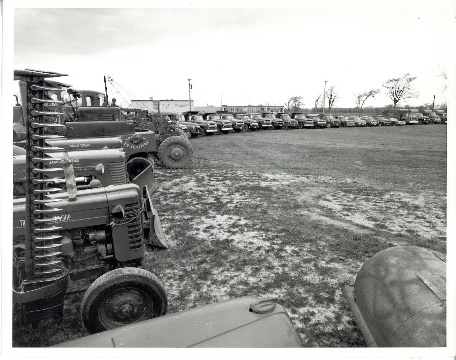 DescriptionBlack and white photograph of the Trafalgar Township vehicles and machinery on display at Trafalgar Square; A range of vehicles can be seen side by side surrounding Trafalgar Square; All of the vehicles are the same in colour; Many of the machinery has "Trafalgar Township" on the side; A couple of vehicles have "Trafalgar Township Roads Dept." specified on them'