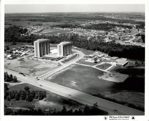 DescriptionBlack and white aerial photograph of Trafalgar Road and White Oaks Boulevard; The Oakville Municipal Building can be seen on the proper left just off of White Oaks Boulevard on the South side; The Trafalgar Heights apartments on the Northside of White Oaks Boulevard can be seen on the proper right; Vehicles can be seen traveling in both directions on Trafalgar Road; In the distance is greenspace and residential housing in the Holton Heights area of Oakville; Mississauga can be seen in the very far distance;On bottom proper right corner " Phil Aggus & Son Limited 460 Cimberland Avenue - Hamilton, Ont.