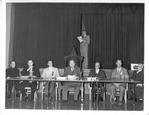 DescriptionBlack and white photograph of the Special Council Meeting for Oakville's Centennial; Mayor William Anderson can be seen sitting center in the Mayor's Chair; To the proper right (left) of the Mayor is Robert Pratt the Mayor of Dorval Quebec; Part of the Council Meeting is for the Twinning between the Town of Oakville and Dorval Quebec; A man can be seen standing on the stage making a speech;