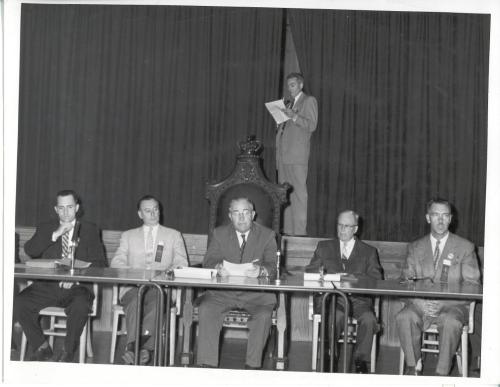 DescriptionBlack and white photograph of the Special Council Meeting for Oakville's Centennial; Mayor William Anderson can be seen sitting center in the Mayor's Chair; To the proper right (left) of the Mayor is Robert Pratt the Mayor of Dorval Quebec; Part of the Council Meeting is for the Twinning between the Town of Oakville and Dorval Quebec; A man can be seen standing on the stage making a speech;