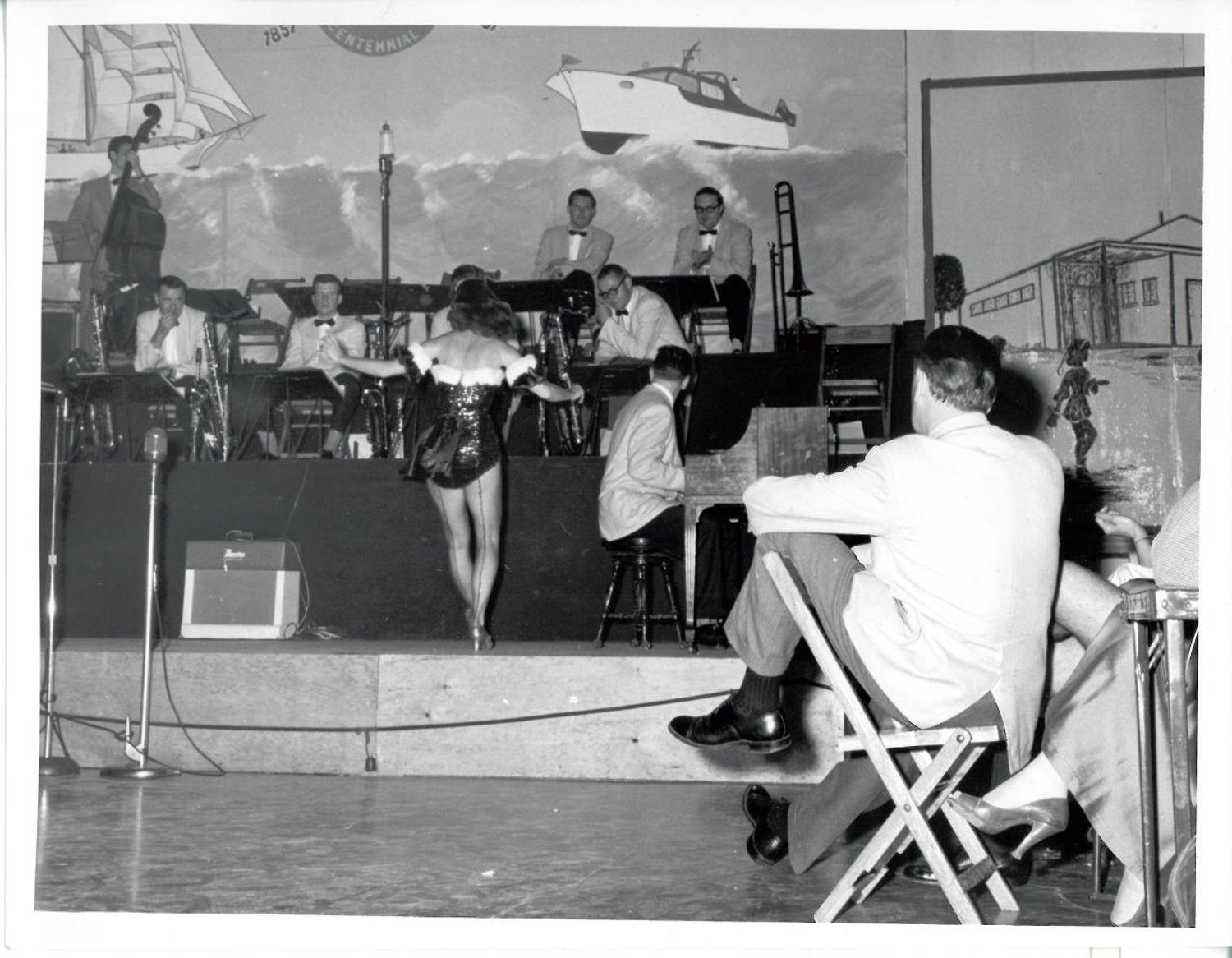 DescriptionBlack and white photograph of a dancer preforming on the stage at the Centennial Ball inside Oakville Arena; The bandstand can be seen in the background; On the proper left is a man sitting on a chair with his left leg over the back of the chair;