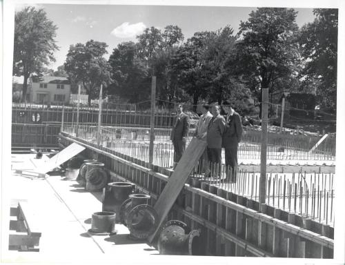 DescriptionBlack and white photograph of four men standing on the construction site of the pump house on Kerr Street by Lake Ontario; There are various large pipe parts on the site; A home on the corner of Wilson Street and Water Street can be seen in the background; A few homes on Water Street Facing North can be seen on the proper left in the distance;