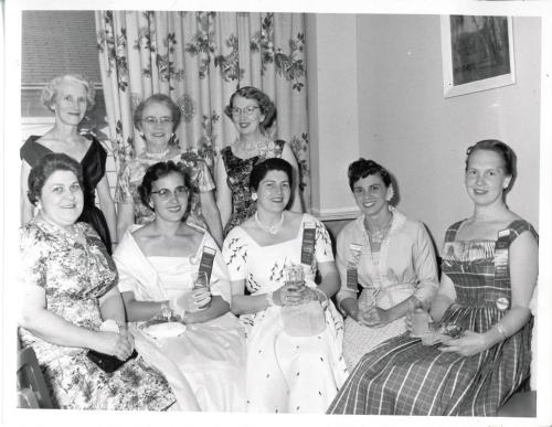 DescriptionBlack and white photograph of the Town Councilor’s Wives; five of the women are sitting and three of them are holding a beverage; three other women are standing behind the group;