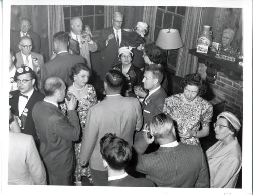 DescriptionBlack and white photograph of people at a reception; people can be see standing a socializing; Hubert Chisholm can be seen standing center in the back;