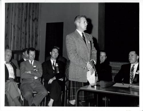 DescriptionBlack and white photograph of a man speaking at the Special Council Meeting on June 29, 1957; on the far left sitting is Councilor E. Dean Wilkes followed by Councilor Allan Day and Councilor John Kobzey; on the far right sitting behind the table is Dennis Camm