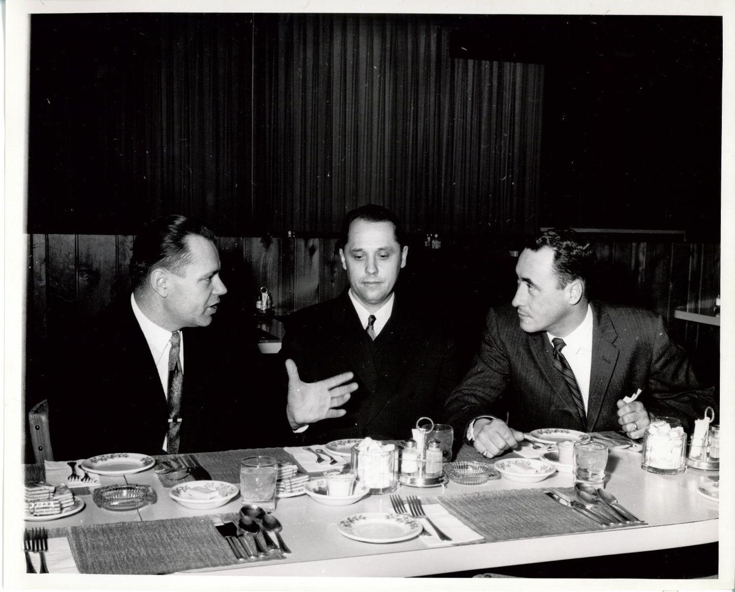 DescriptionBlack and white photograph pf three men sitting at a table inside a restaurant; the men are conversing with one another; the Man on the far right is Ron Cooksey;
