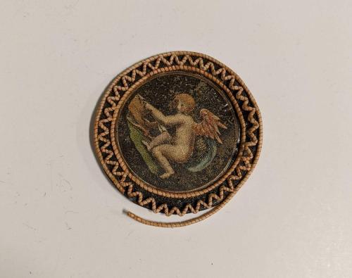 DescriptionCircular ornament, printed image of cherub with arrow which has been hand painted, zig-zag and linear white and red rolled paper border, no protective glass.