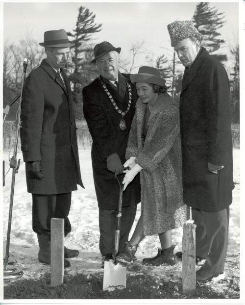 DescriptionBlack and white photograph of the groundbreaking ceremony for the Oakville Municipal Building; Oakville Mayor Al Masson can be seen standing second on the left holding a shovel with Mrs. Dunwoody; Ontario MPP George Albert Kerr can be seen standing to the right of Mrs. Dunwoody;