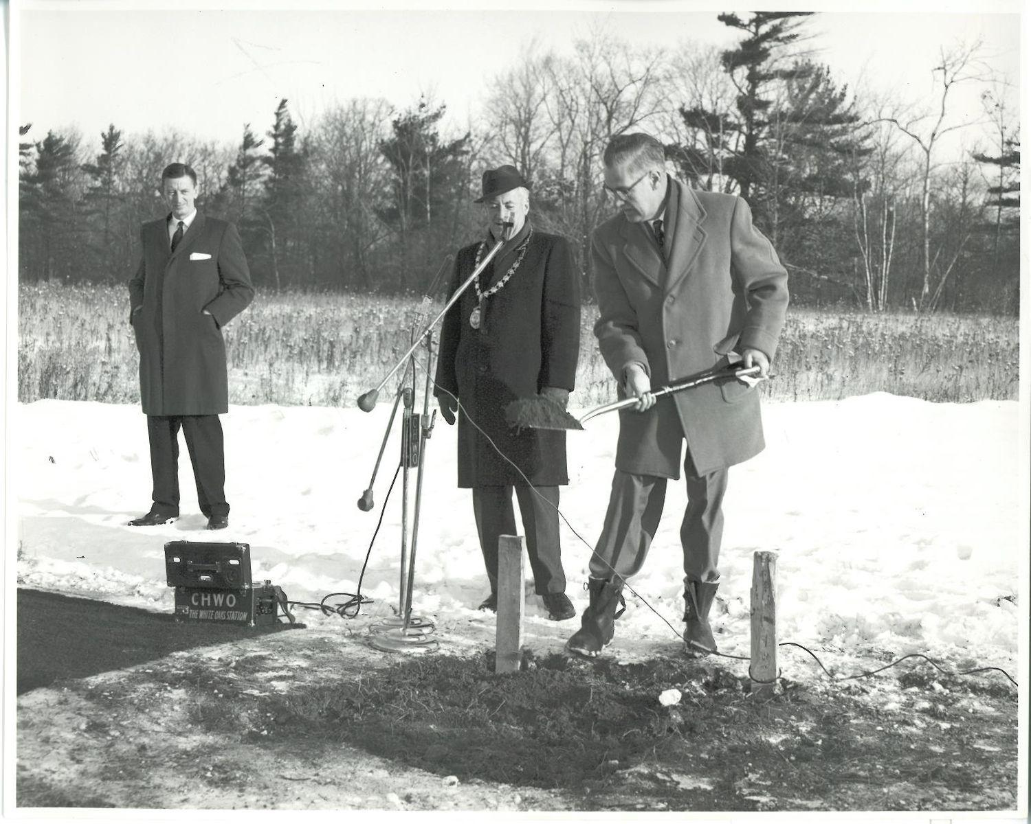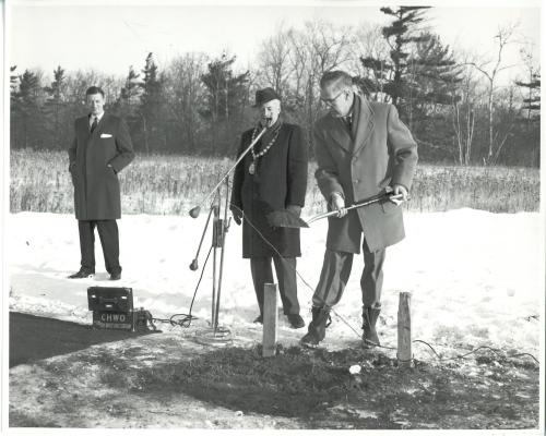 DescriptionBlack and white photograph of the Groundbreaking Ceremony for the Oakville Municipal Building; Reeve Herb Merry can be seen holding a shovel and turning over the soil; Davin Senst can be seen standing on the far left; Mayor Al Masson can be seen standing center wearing the Chain of Office; Snow covered ground can be seen in the background; A tree line can be seen in the distance;