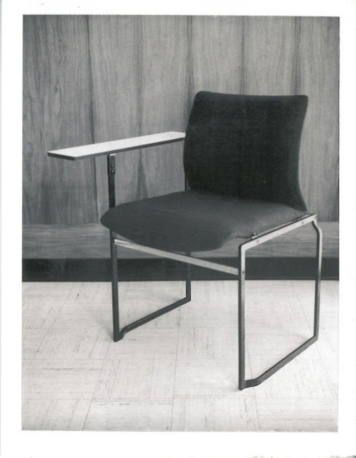 Black and white photograph of a chair with a ledge/arm on the right