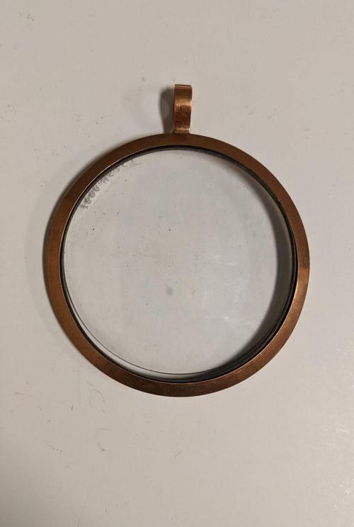 Circular ornament frame with loop at top for chain, protective domed glass.