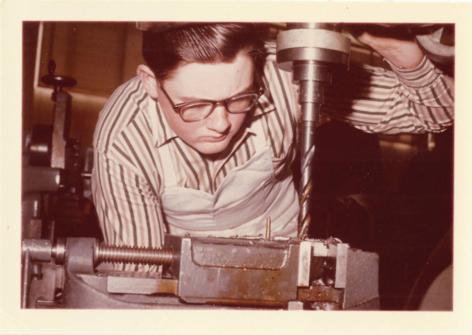 Colour photograph of a student using a drill press; the young man is wearing safety glasses;