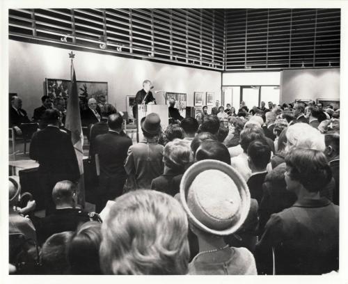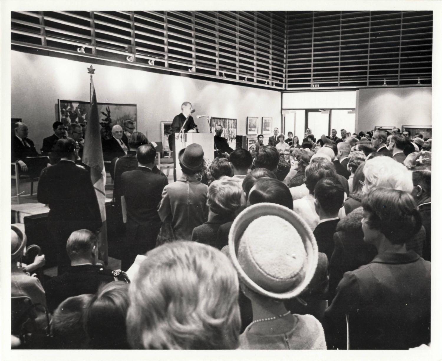DescriptionA black and white photograph of a presentation for the opening ceremonies for the Centennial Square and buildings being held inside Oakville Gallery part of the Central Library building; an audience of spectators can be seen watching the presentation; Reverend Father W.R. Anthony can be seen making the speech at the podium; Other dignitaries can be seen sitting of the stage behind the podium