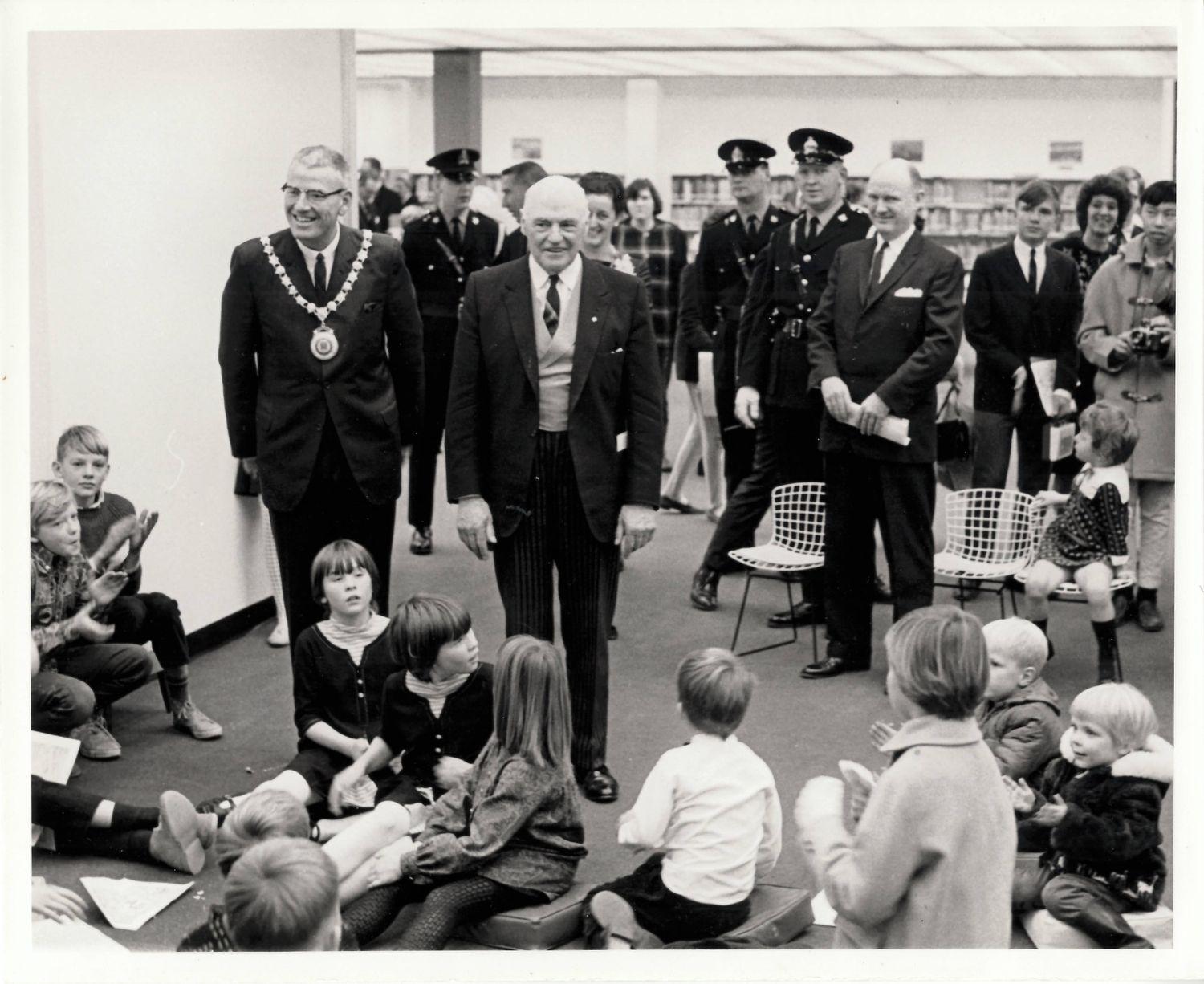 DescriptionBlack and white photograph of Lieutenant Governor of Ontario Earl Rowe inside the Central Library; He is standing center with Mayor F.M. Anderson on the left; Children can be seen sitting on the floor and clapping; Three Police officers can be seen in the background along with other onlookers;