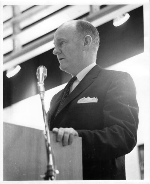 DescriptionBlack and white photograph of Chairman Mr. D. H. W. Bath of the Public Library Board speaking at the Centennial Center Opening Ceremonies