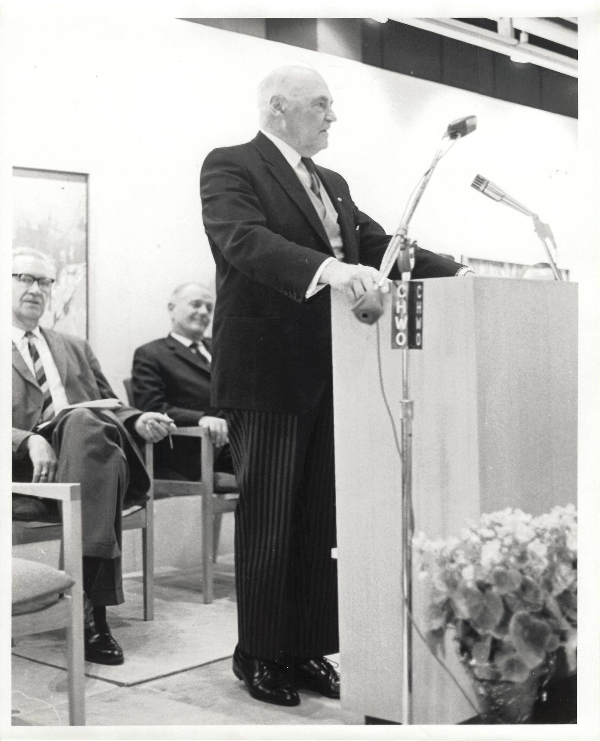 Hon. Earl Rowe speaking at the Opening Ceremonies for the Centennial Building (Central Library & Art Gallery)
