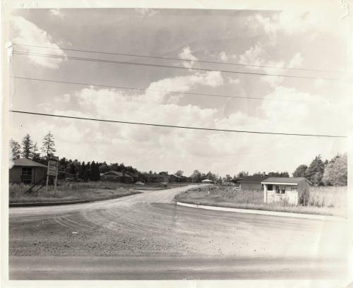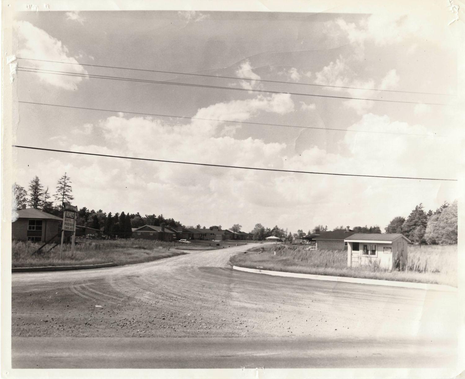DescriptionBlack and white photograph of the intersection of Lakeshore Road West and Woodhaven Park Drive facing north; an advertising sign can be seen on the left (proper right) for the residential subdivision; The sign reads "HOMES, BEAUTIFUL LOTS, PAVED DRIVES, SEWERS AND WATER";