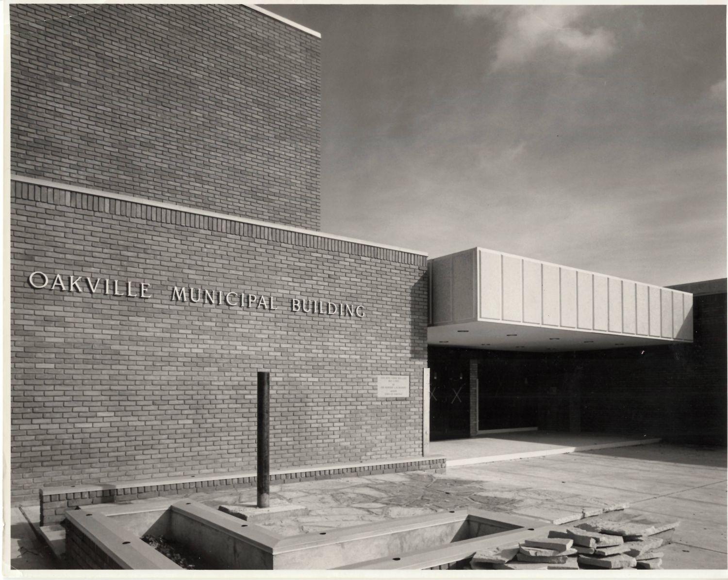 DescriptionBlack and white photograph of the Oakville Municipal Building main entrance prior to opening the building; "OAKVILLE MUNICIPAL BUILDING" can be seen on one of the exterior walls to the left of the doors;