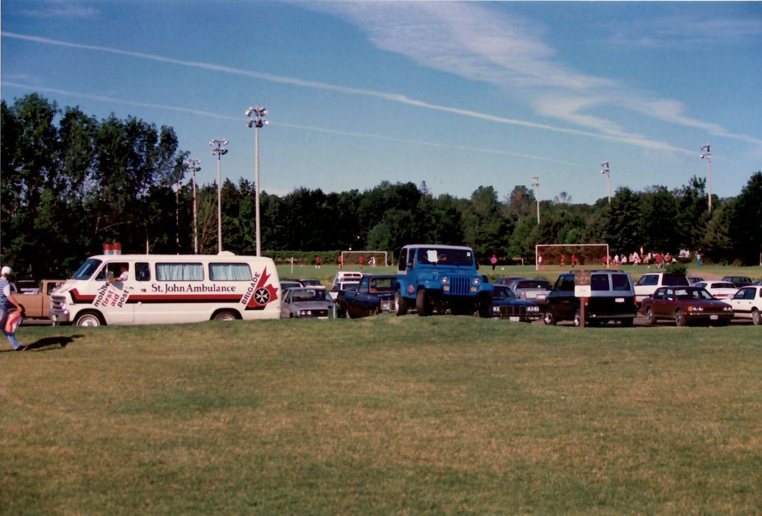 DescriptionColour photograph of the Oakville Soccer Club Tournament held at Shell Park; Vehicles can be seen in the parking lot; A St. John’s Ambulance is parked on the felt; In the distance is a soccer field with players playing a game on the field;
