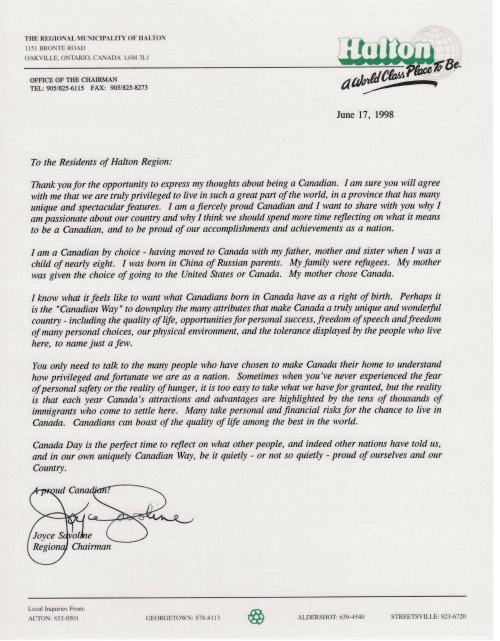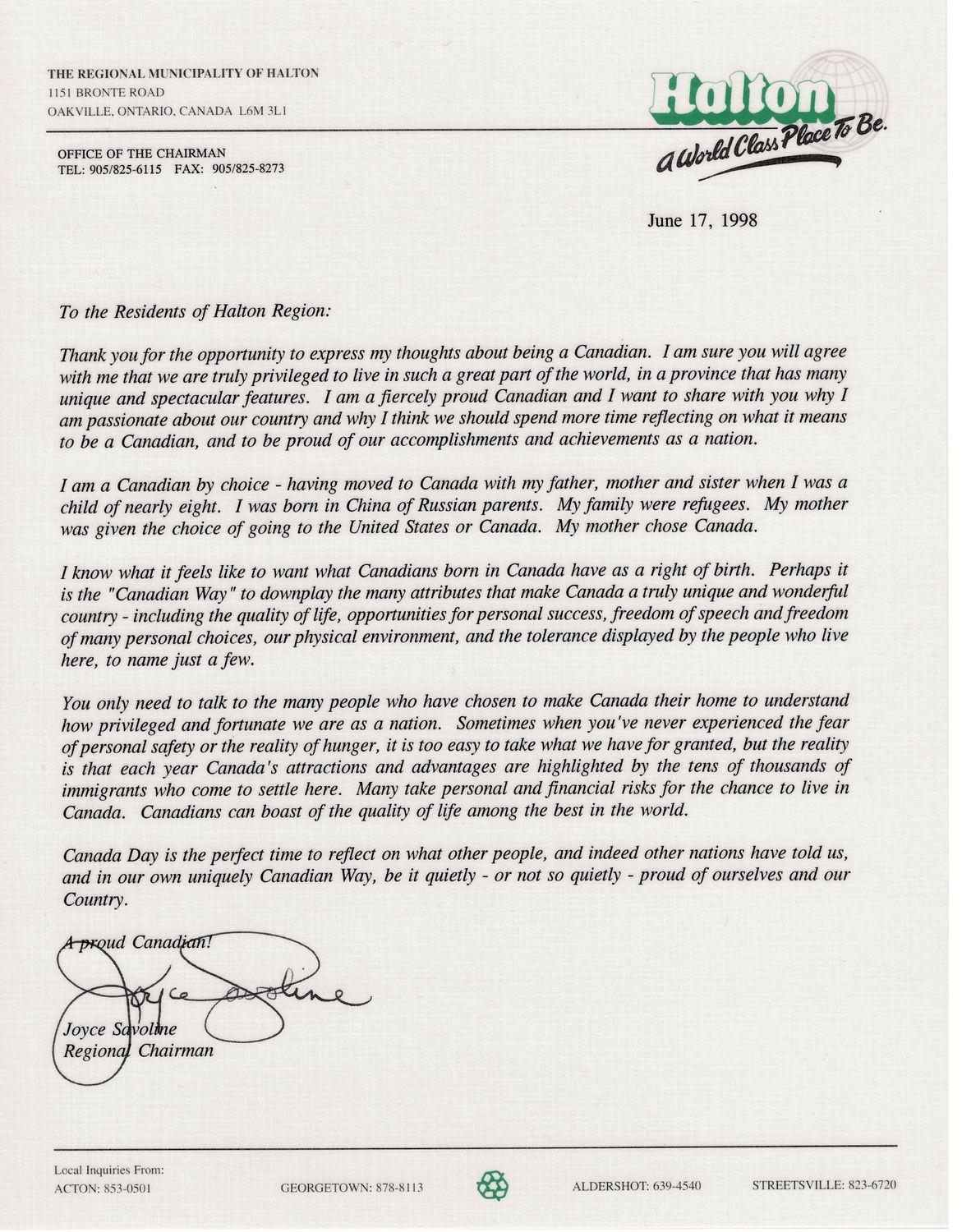 DescriptionLetter typed on Halton Region letterhead from the Regional Chair Joyce Savoline to the residents of Halton Region about what it's like being Canadian dated June 17, 2018