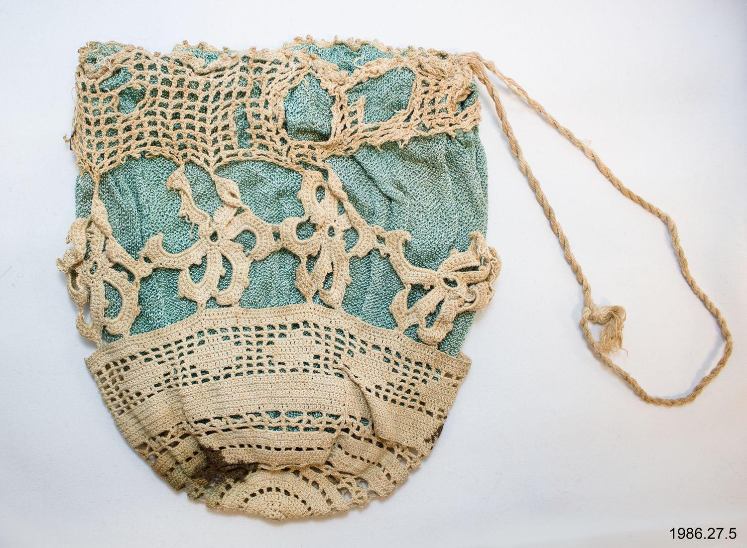 DescriptionBlue-green cloth purse with crocheting over top; three inches of crocheting at the bottom; open lattice work in the middle; mesh along top edge; twisted string handle.