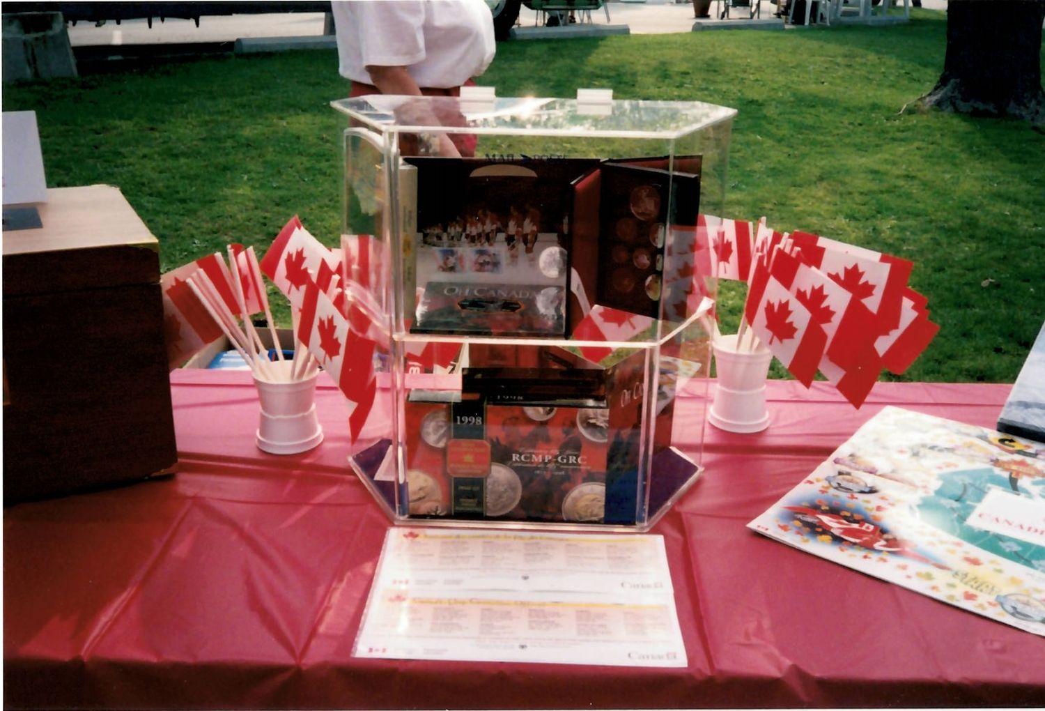 DescriptionColour photograph showing part of the items on display for the 1998 Time Capsule and prizes for the Speak Out!... Canada... Pensons-y! Contest; A Plexiglas display of coin collections can be seen in center; On either side of the coins are cups holding paper Canada flags; The Time Capsule box can been on the left;
