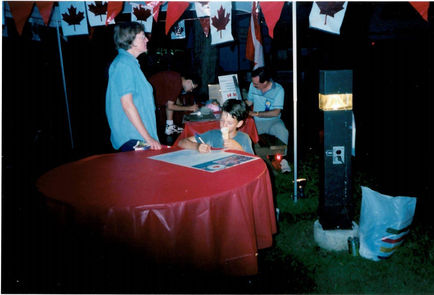 DescriptionColour photograph of a young boy holding an ice cream cone while filling out a ballot for the Speak Out!... Canada... Pensons-y! Contest at Coronation Park during the Oakville Waterfront Festival; one of the park lamp posts can be seen to the right of the table where the young boy is sitting; a parent is standing to the left of the young boy; in the background other people can be seen filling out ballots for the contest; the picture was taken at nighttime;