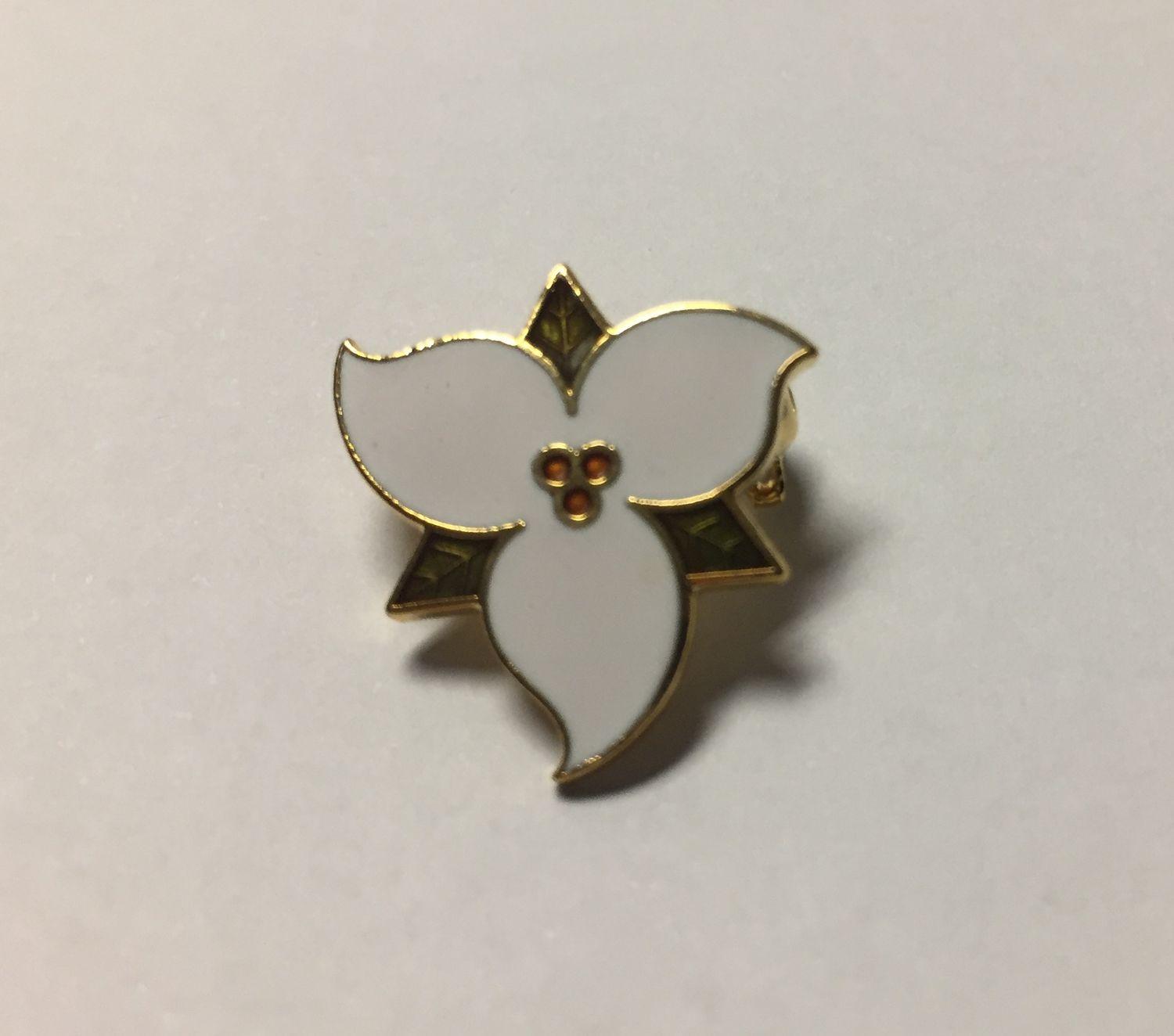 Small metal and enamel trillium pin; "c" clasp on the back; Back is gold plated;