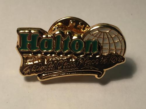 DescriptionSmall metal lapel pin from Halton Region; The pin has "Halton" in green enamel; "A World Class Place To Be" is at the bottom of the pin in black enamel;
