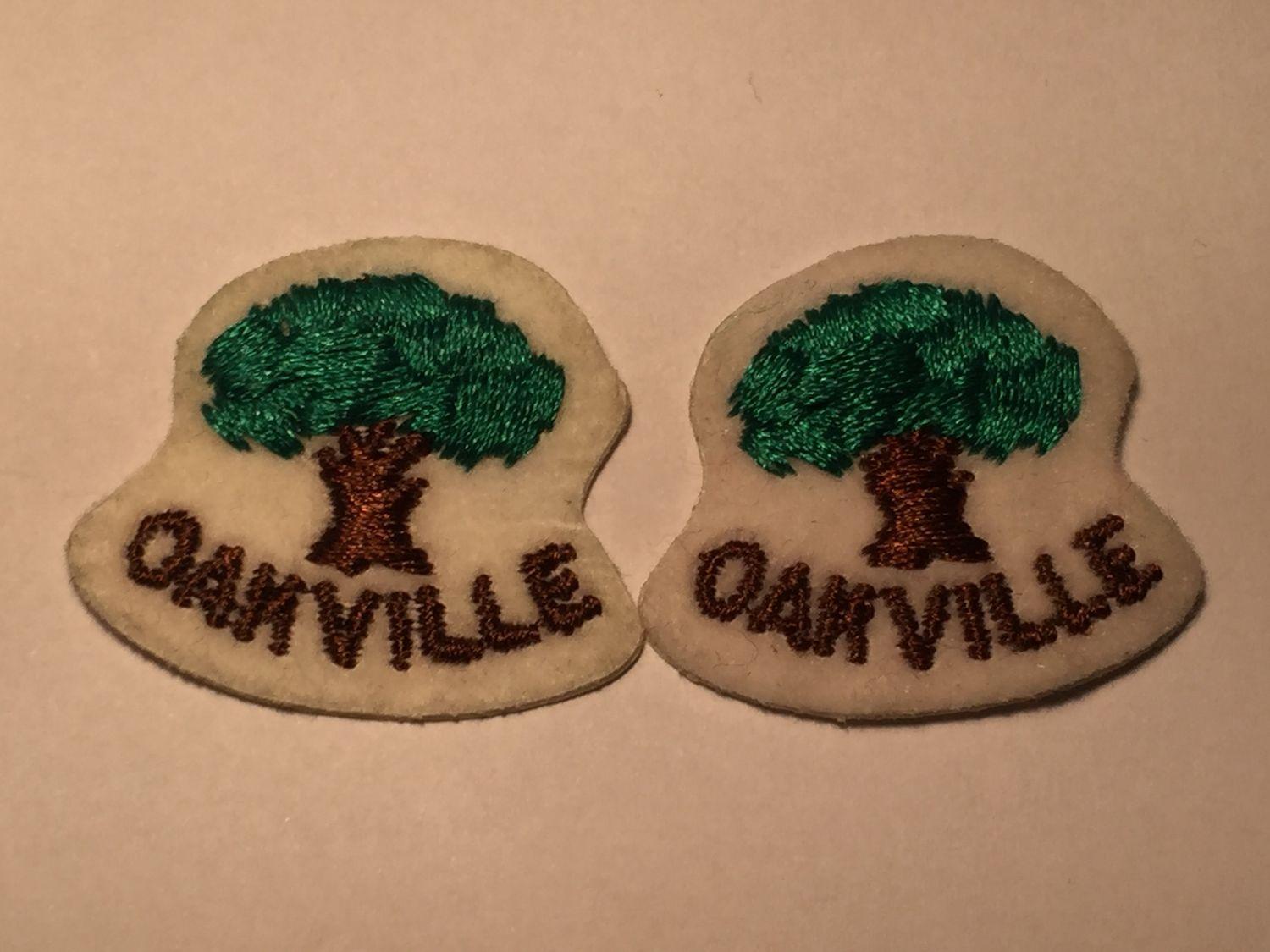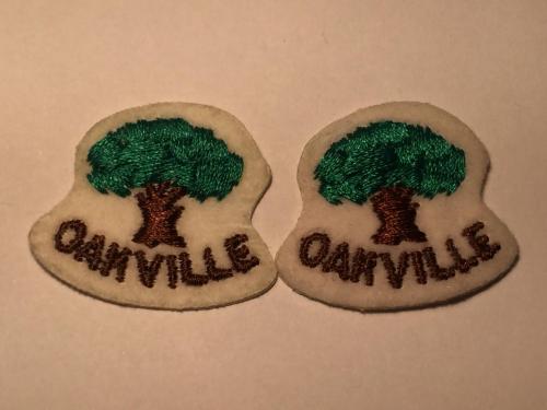 DescriptionTwo felt stickers with a tree and "OAKVILLE"; The trees are made of green and brown thread; "OAKVILLE" is stitched in brown thread;